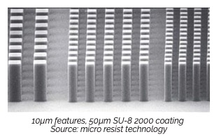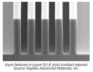 型號(hào):SU-8 3005/SU-8 3010/SU-8 3025/SU-8 3035/SU-8 3050 單層厚度:5~100um 光源:負(fù)性 Near UV(350-400nm),推薦i-Line,也可用于E-beam,X-ray 。 應(yīng)用:光電器件,微流體,MEMS芯片制作以及作為芯片絕緣層、保護(hù)層使用。 特點(diǎn):高寬比大(5:1),SU-8 3000系列較SU-8 2000具有更好的基底粘附力,減少了在工藝過程中產(chǎn)生內(nèi)應(yīng)力積累。 |