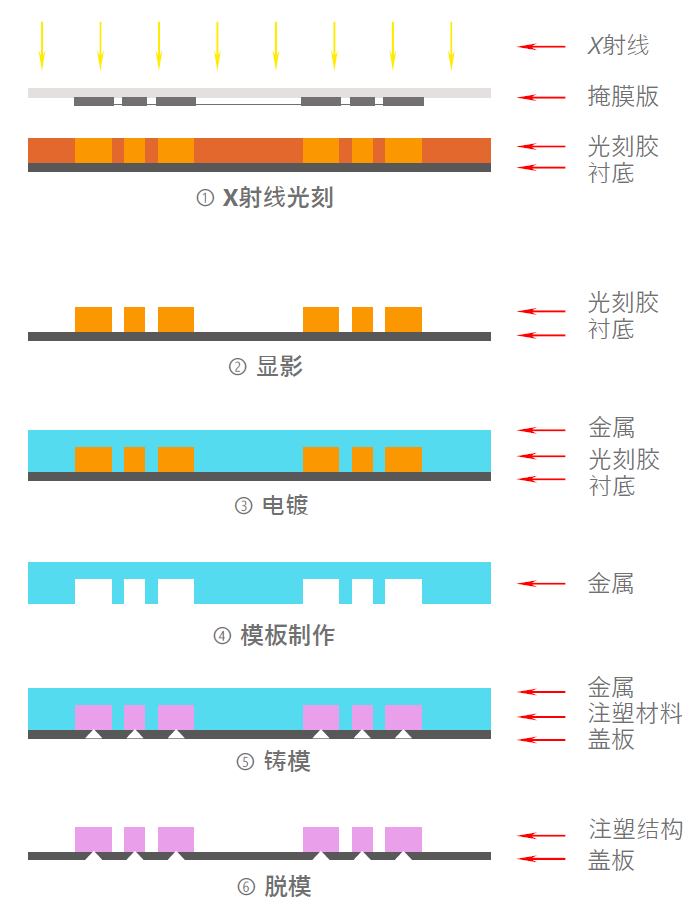 LIGA工藝流程一般包括以下四個重要步驟:X射線曝光、顯影、電鑄制模、注塑復制。如下圖所示LIGA一般工藝流程: