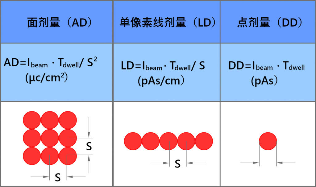 圖2 點(diǎn)、線、面形狀的曝光區(qū)域?qū)?yīng)的劑量計(jì)算公式