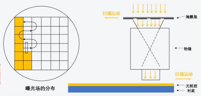 步進(jìn)掃描光刻被大量采用:步進(jìn)掃描光刻機(jī)在曝光視場尺寸及曝光均勻性上更有優(yōu)勢,在0.25μm以下的制造中減少了步進(jìn)重復(fù)光刻機(jī)的應(yīng)用。步進(jìn)掃描采用動態(tài)掃描方式,掩膜版相對晶圓同步完成掃描運動,完成當(dāng)前曝光后,至下一步掃描場位置,繼續(xù)進(jìn)行重復(fù)曝光,直到整個晶圓曝光完畢。從0.18μm節(jié)點開始,硅基底CMOS工藝大量采用步進(jìn)掃描光刻,7nm以下工藝節(jié)點使用的EUV采用的也是步進(jìn)掃描方式。