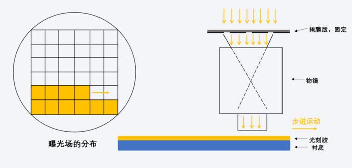 步進(jìn)重復(fù)光刻主要應(yīng)用于0.25μm以上工藝:光刻時掩膜版固定不動,晶圓步進(jìn)運動,完成全部曝光工作。隨著集成電路的集成度不斷提高,芯片面積變大,要求一次曝光的面積增大,促使更為先進(jìn)的步進(jìn)掃描光刻機(jī)問世。目前步進(jìn)重復(fù)光刻主要應(yīng)用于0.25μ m以上工藝及先進(jìn)封裝領(lǐng)域。