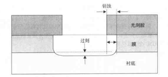 刻蝕偏差是指刻蝕以后線寬或關(guān)鍵尺寸間距的變化(見圖1)。它通常是由于橫向鉆刻引起的(見圖2),但也能由刻蝕剖面引起。當(dāng)刻蝕中要去除掩模下過量的材料時(shí),會引起被刻蝕材料的表面向光刻膠邊緣凹進(jìn)去,這樣就會產(chǎn)生橫向鉆刻。計(jì)算刻蝕偏差的公式如下: