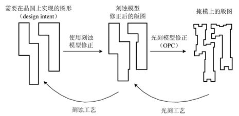 刻蝕偏差的大小與很多因素有關(guān):襯底材料、光刻膠上圖形的線寬、刻蝕工藝的參數(shù)等。目前額做法是對版圖上所有的邊緣添加(或減去)一個(gè)固定的線寬,被稱為全片刻蝕偏差(global etch bias)。顯然,這樣的做法比較粗糙,設(shè)有顧及刻蝕偏差是與光刻膠上的線寬有關(guān)的。精確地做法是,建立一個(gè)刻蝕的模型,首先對設(shè)計(jì)的版圖做修正;然后,在做光刻的OPC修正,如圖2(第七章光刻鄰近效應(yīng)修正與計(jì)算光刻 P359 圖7.40)所示??涛g修正可以使用模型,也可以是一些規(guī)則(類似于rules-based OPC)。也有嘗試把刻蝕修正與光學(xué)修正合成在一起的。